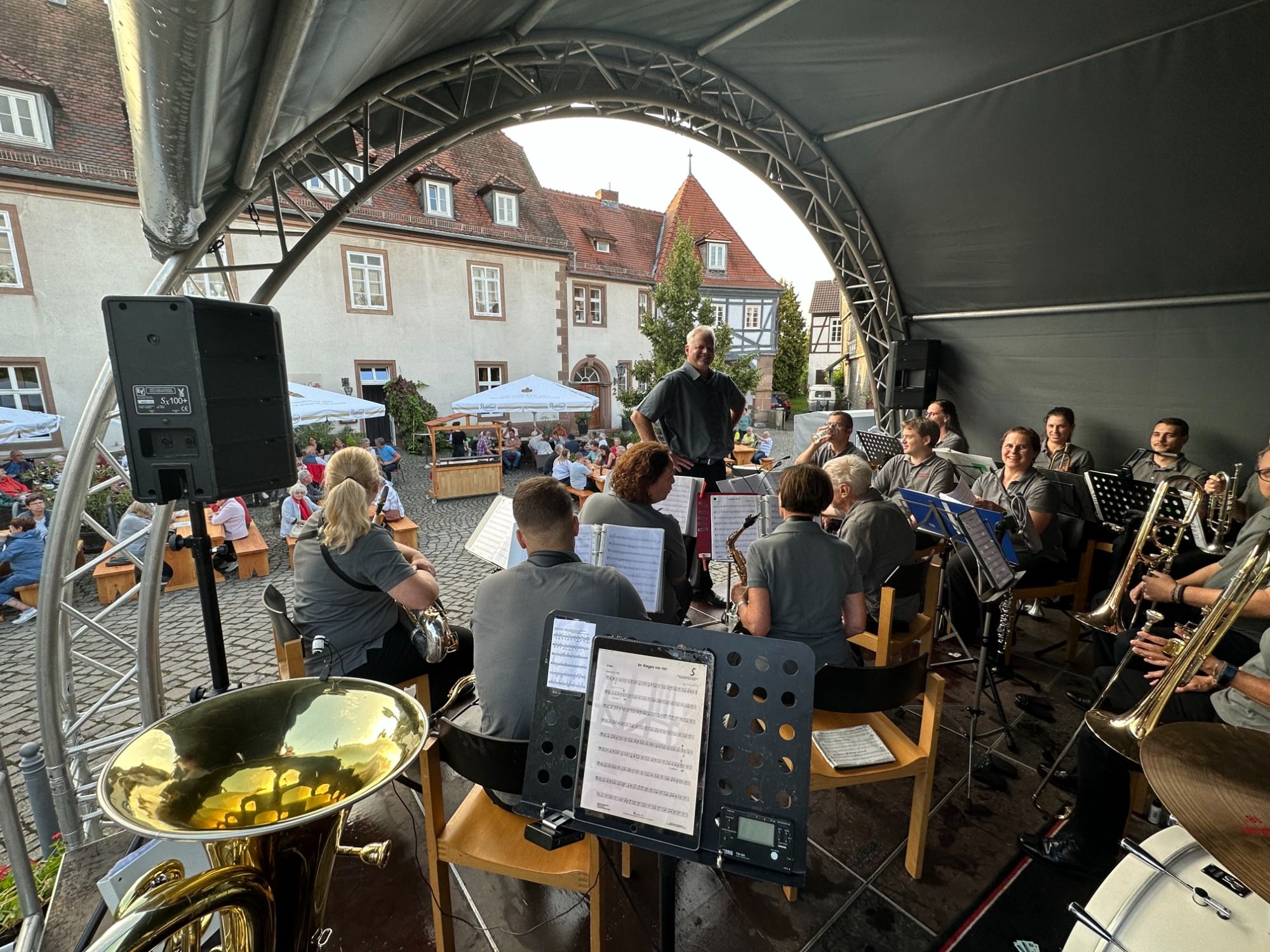 Doch gegen 17 Uhr brach sich die Sonne Bahn, um die Tische und Bänke auf dem Paradeplatz zu trocknen. Dort unterhielt das Blasorchester Schwalmstadt unter Leitung von Dr. Karsten Heyner die Besucher mit einem Querschnitt durch sein Repertoire von Swing über Polka, Tango, Abba bis hin zu Popmusik. Nach einer kurzen Umbaupause rundete die bedingt durch Corona entstandene „Kleine Besetzung“ des Orchesters mit neuartigen, an die Tiroler Blasmusikformation „Viera Blech“ angelegten Interpretationen das Konzert ab.