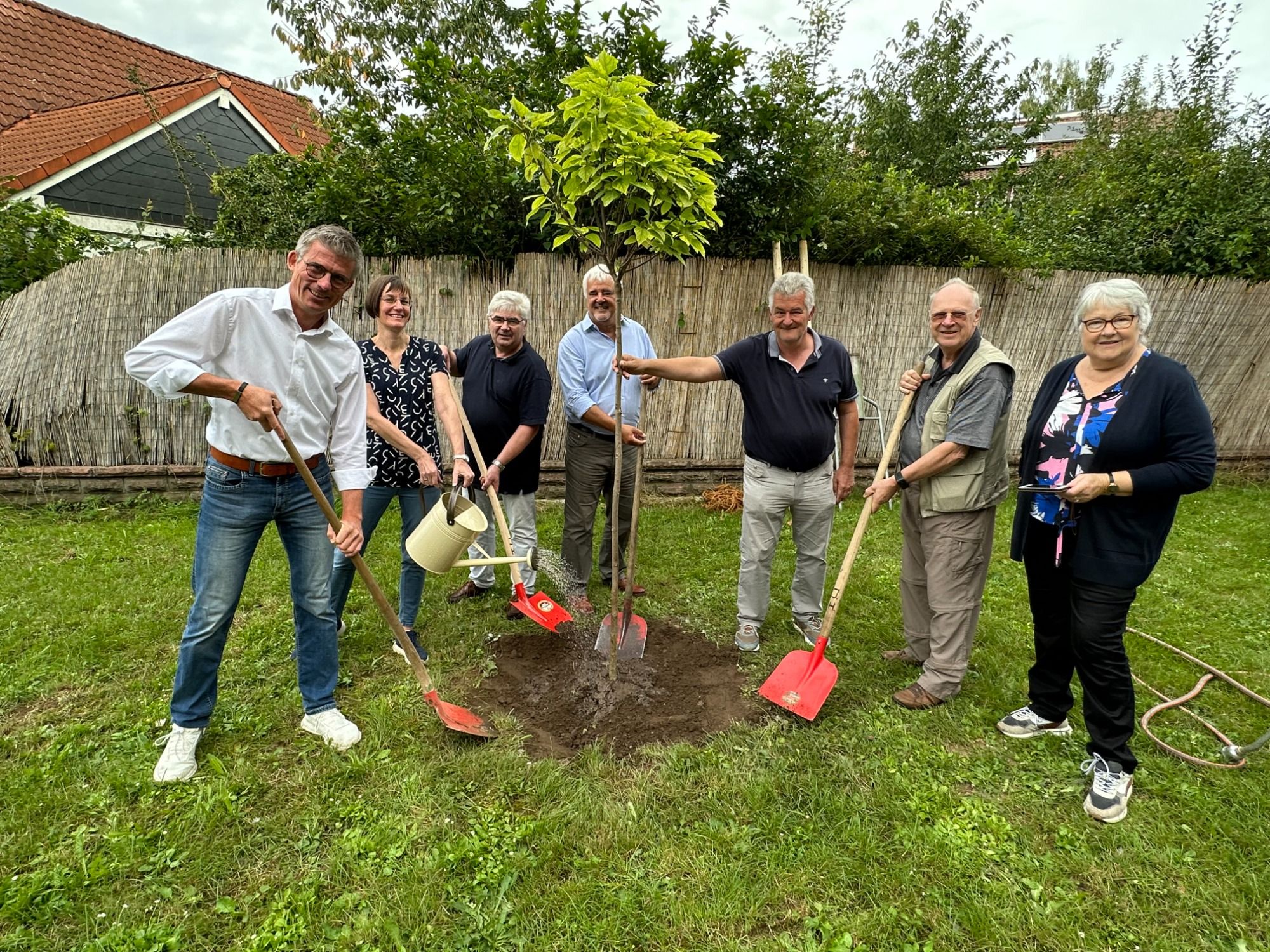Zu viert griff man zu den Schaufeln und setzte Baum und Gedenktafel in das vorbereitete Erdloch. Für ein gutes Anwachsen hatte der ehemalige Bürgermeister Stefan Pinhard extra eine Gießkanne Wasser aus der Schwalm geschöpft und Vorsitzende Astrid Quernheim goss den stattlichen Wurzelballen sorgfältig an.